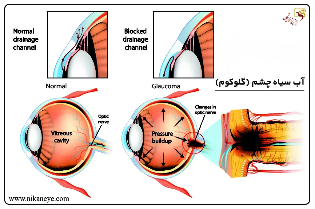 همانگونه که اشاره شد عارضه آب سیاه نتیجه آسیب به عصب بینایی است. همانطور که این عصب به تدریج خراب می شود، نقاط کور در میدان بینایی شما ایجاد می شود. به دلایلی که پزشکان به طور کامل درک نمی کنند، این آسیب عصبی معمولاً به افزایش فشار در چشم مربوط می شود. افزایش فشار چشم به دلیل تجمع مایع (زلالیه) است که در داخل چشم شما جریان دارد. این مایع داخلی معمولاً از طریق بافتی به نام شبکه ترابکولار در زاویه ای که عنبیه و قرنیه به هم می رسند، تخلیه می شود. هنگامی که مایع بیش از حد تولید می شود یا سیستم زهکشی و تخلیه به درستی کار نمی کند، مایع نمی تواند با سرعت طبیعی خود خارج شود و فشار چشم افزایش می یابد. گفتنی است که تاکنون در برخی افراد، دانشمندان ژن های مربوط به فشار چشم بالا و آسیب عصب بینایی را شناسایی کرده اند.